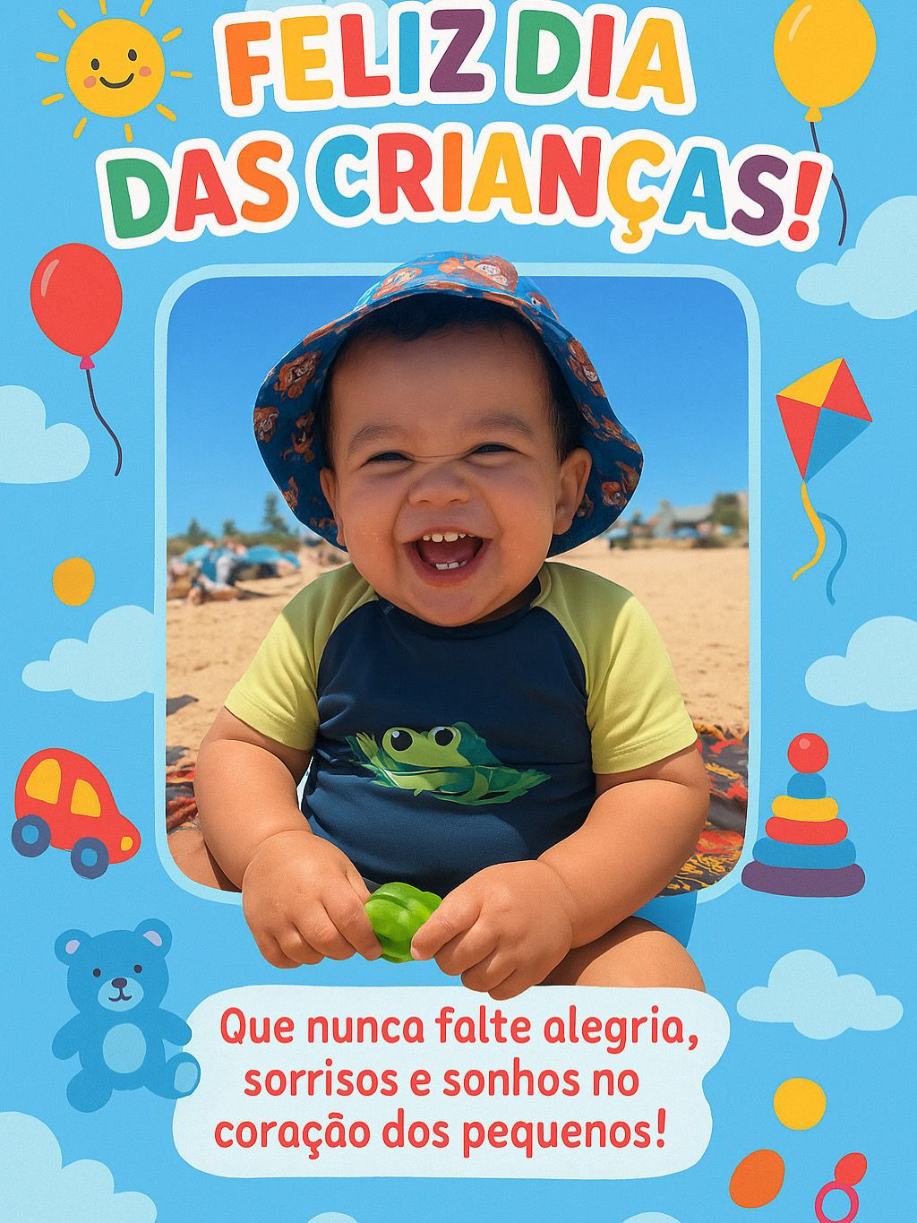 "Feliz Dia das Crianças! Que este dia seja repleto de alegria, sorrisos e amor. Desejamos que vocês continuem brilhando e enchendo o mundo de cores e felicidade. Parabéns!"